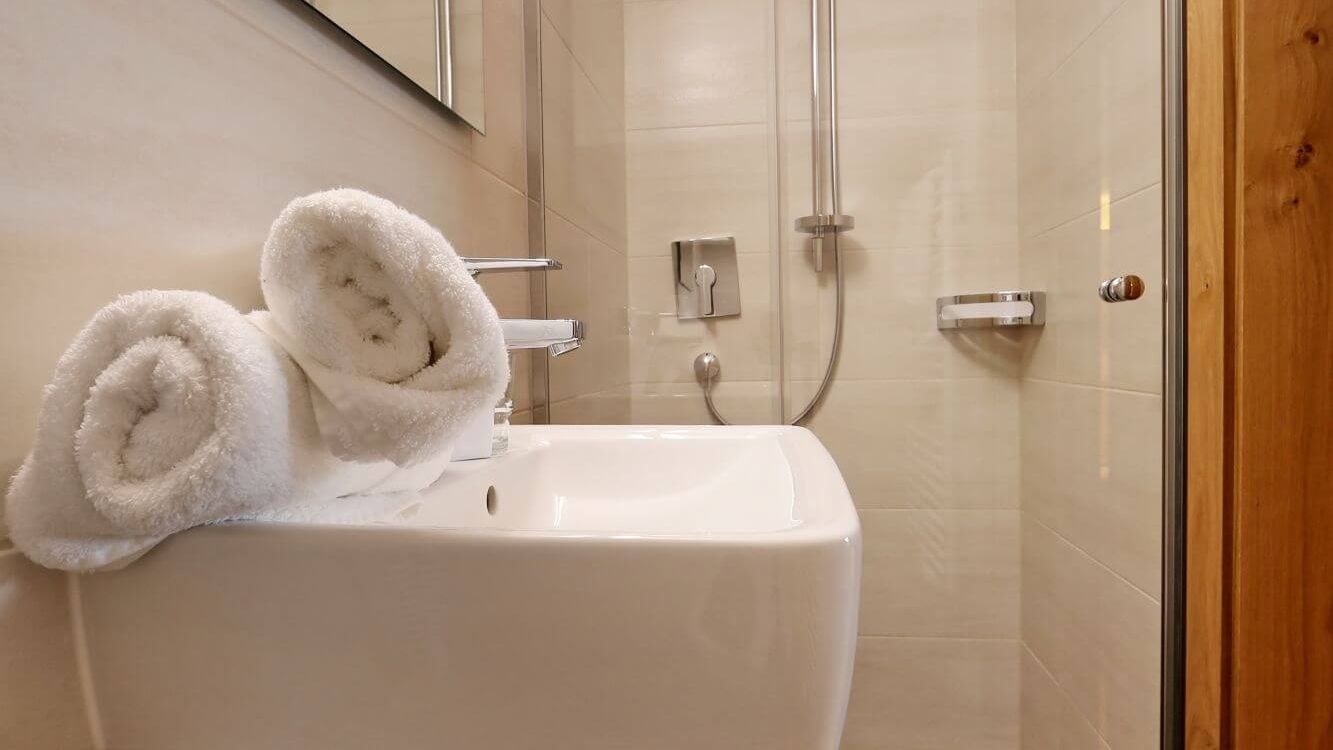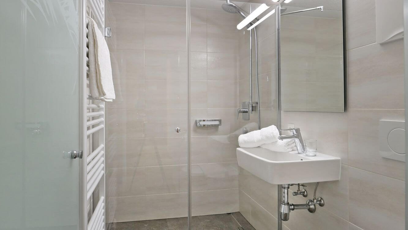This cozy apartment is located on the top floor with 40 m² of living space. The modern living room with panoramic windows has a cozy dining area with satellite TV and a fully equipped kitchenette. The bedroom in stone pine promises restful nights and offers an attached bathroom with shower and toilet. The comfortable pull-out couch offers space for the 3rd or 4th person. The second bathroom with shower / toilet also ensures comfort. The living area leads to the balcony with seating and a view of the ski run to Aschau.